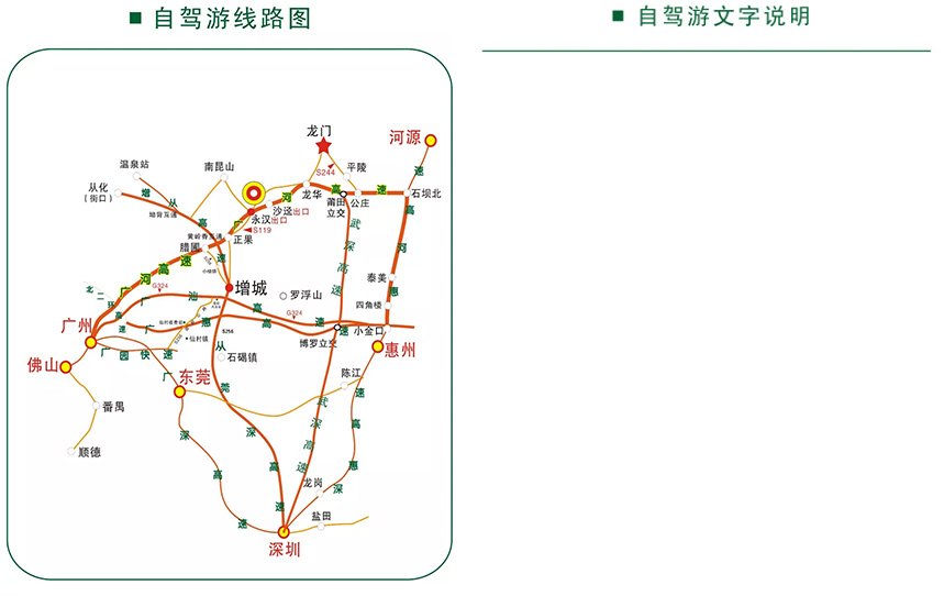 佛山→佛山一环(广佛高速)→华南快速干线(龙洞春岗立交)→广河高速(往河源方向)→永汉(下高速第一个红绿灯,右转往龙门方向8公里)→温泉大观园