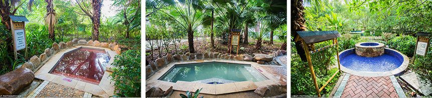 设有南昆山温泉最高水温达82°C,日涌量5000立方米,属高硅酸钙温矿泉水。据中山医科大学的研究化验报告,温泉水含有极其丰富有益人体健康的矿物质元素如钙、镁等几十种对人体有益的微量元素,能起到舒筋活络,强身健体、润肤美容、安神养神、抗衰老等作用。度假区总占地面积60万多平方米,其中温泉池区总占地面积12万平方米,设有日本风情、巴厘岛风情、南美风情、河岸线风光、岭南风情区五个浸泡区,79个功能各异、各具特色的温泉池。其中最具有代表的有让毛孔畅通,排出体内毒素,利于更好地吸收温泉水中的多种矿物质,达到美容养颜、延年益寿之神奇功效的“情趣亲吻鱼”;清洁润肤、收缩毛孔、美容作用的火山。